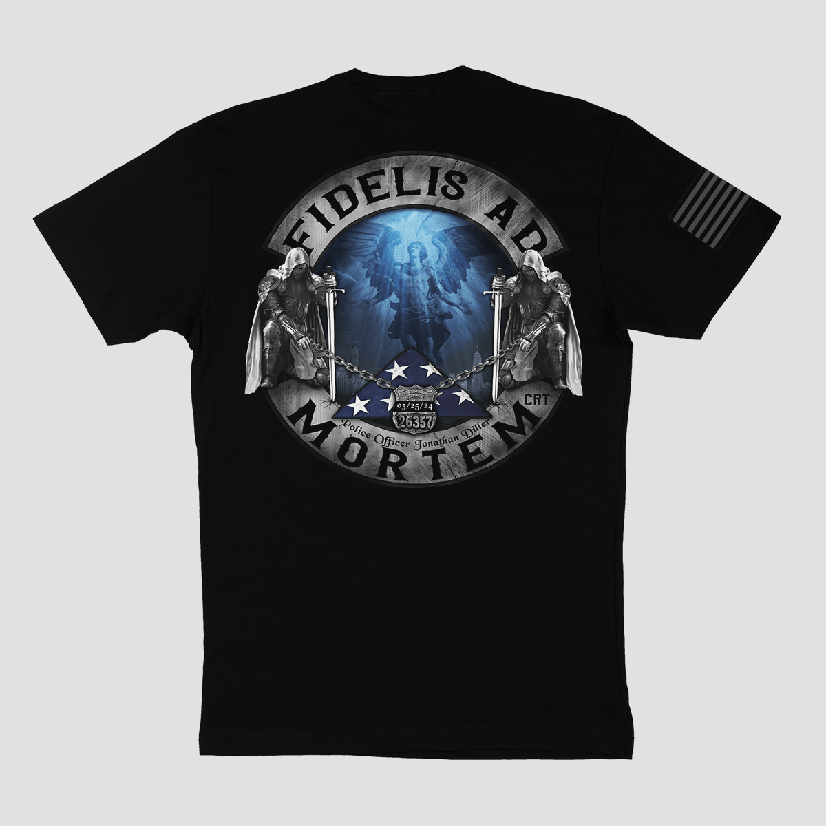 PRODUCTION: This design is labor intensive and will take some time to print. 8 color back print, 6 color front print, one color subdued flag print, inside neck printed labels.